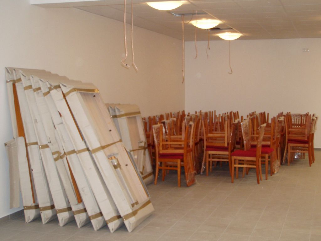 Stoly a židle jsou již připraveny.