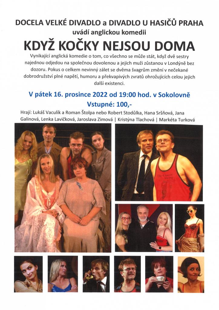DOCELA VELKÉ DIVADLO a DIVADLO U HASIČŮ PRAHA uvádí anglickou komedii KDYŽ KOČKY NEJSOU DOMA. V hlavní roli Lukáš Vaculík.