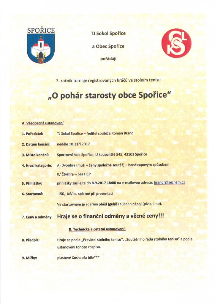 TJ Sokol Spořice a Obec Spořice pořádají 3. ročník turnaje registrovaných hráčů ve stolním tenisu.