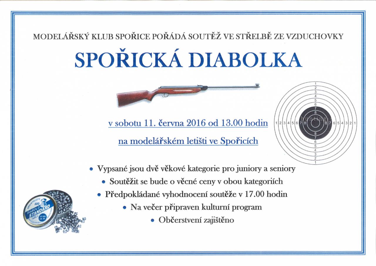Modelářský klub Spořice srdečně zve na tradiční soutěž ve střelbě ze vzduchovky SPOŘICKÁ DIABOLKA, která se koná v sobotu 11. června 2016 od 13.00 hodin na modelářském letišti ve Spořicích.
