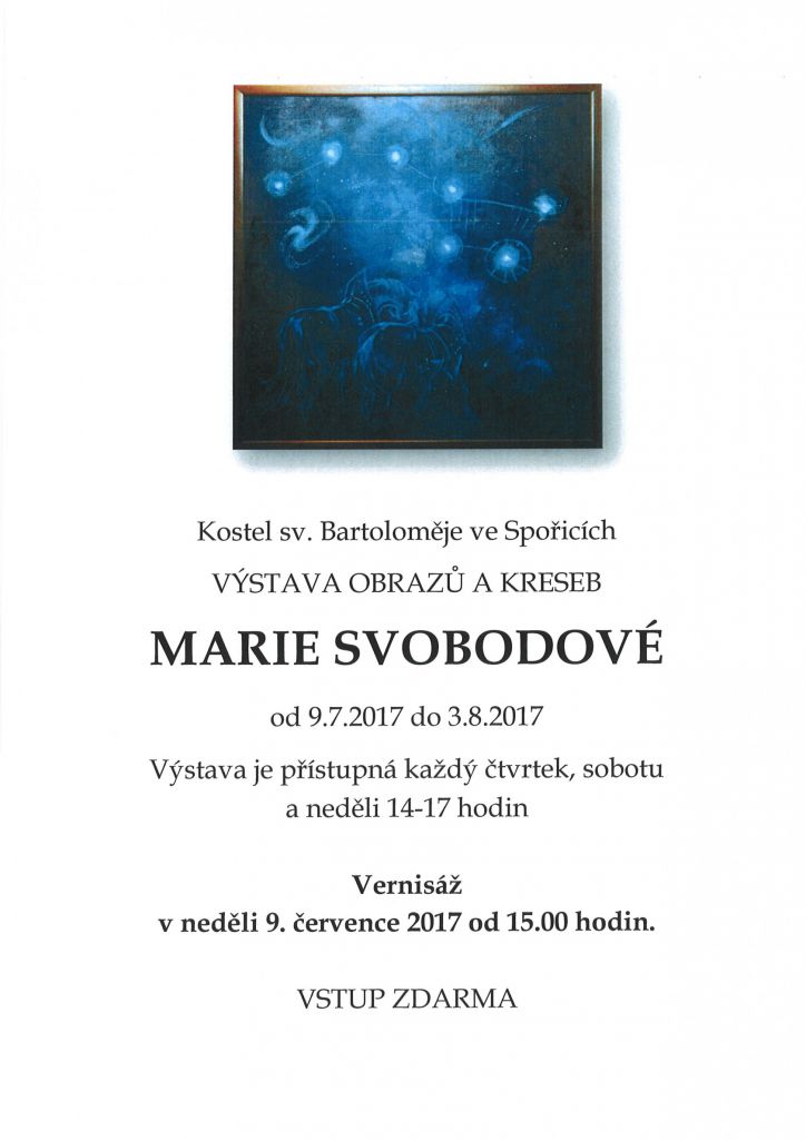 Srdečně zveme na výstavu obrazů a kreseb paní Marie Svobodové, která bude probíhat od 9.7. do 3.8.2017 v kostele sv. Bartoloměje ve Spořicích.