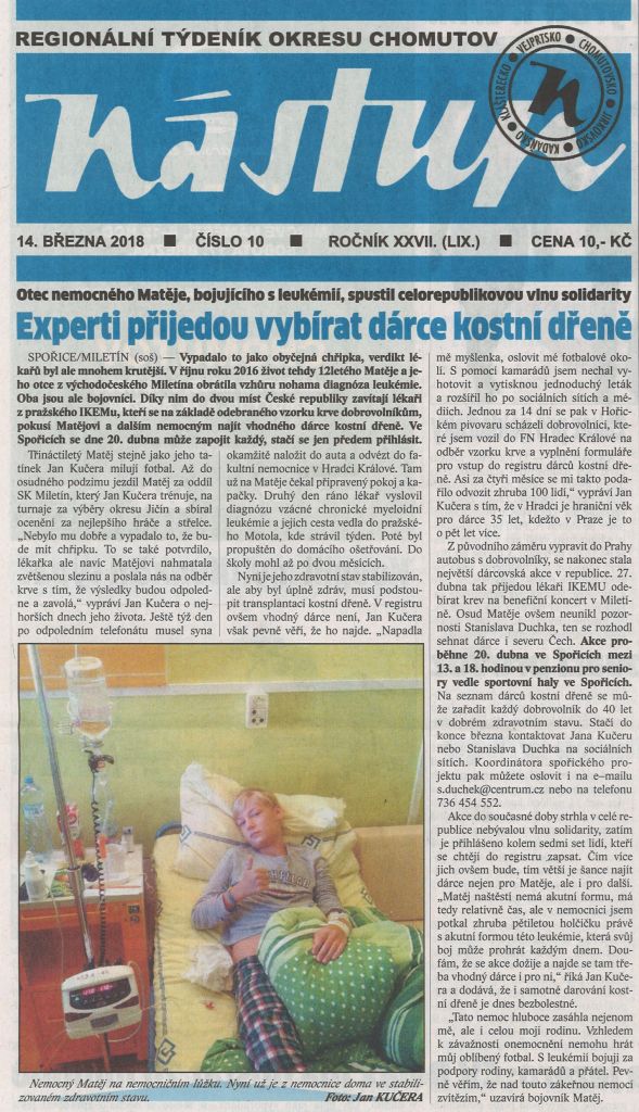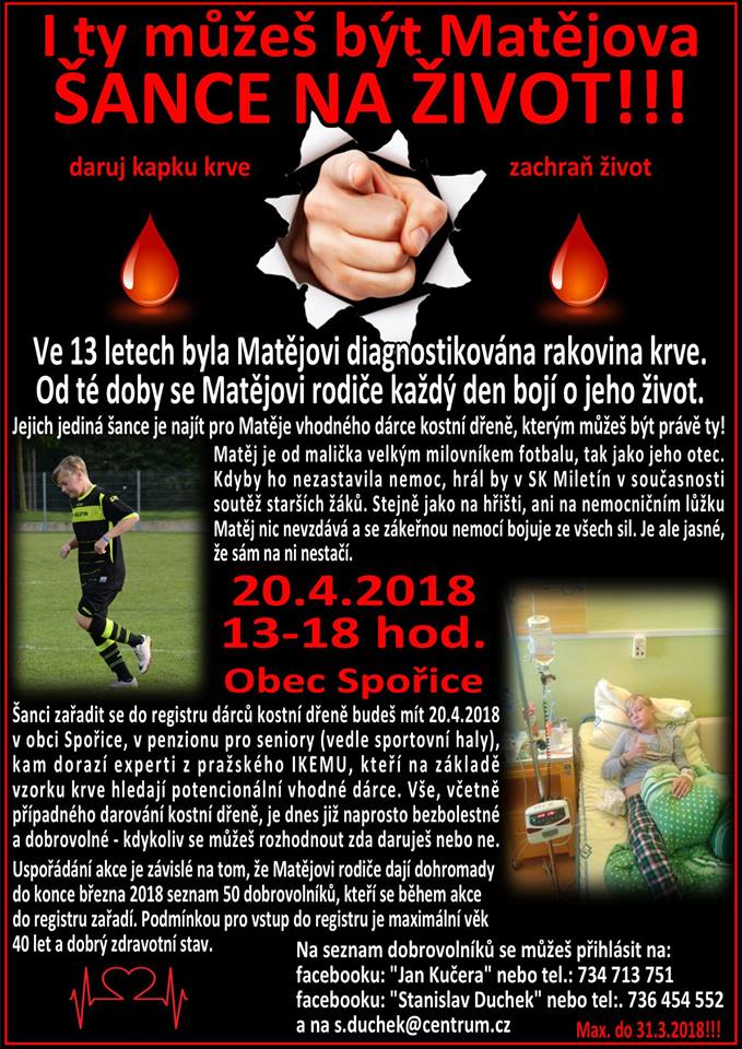 Stačí přijet v pátek 20. dubna 2018 do obce Spořice a darovat krev. Hledáme vhodného dárce kostní dřeně pro třináctiletého Matěje, kterému byla diagnostikována rakovina krve.