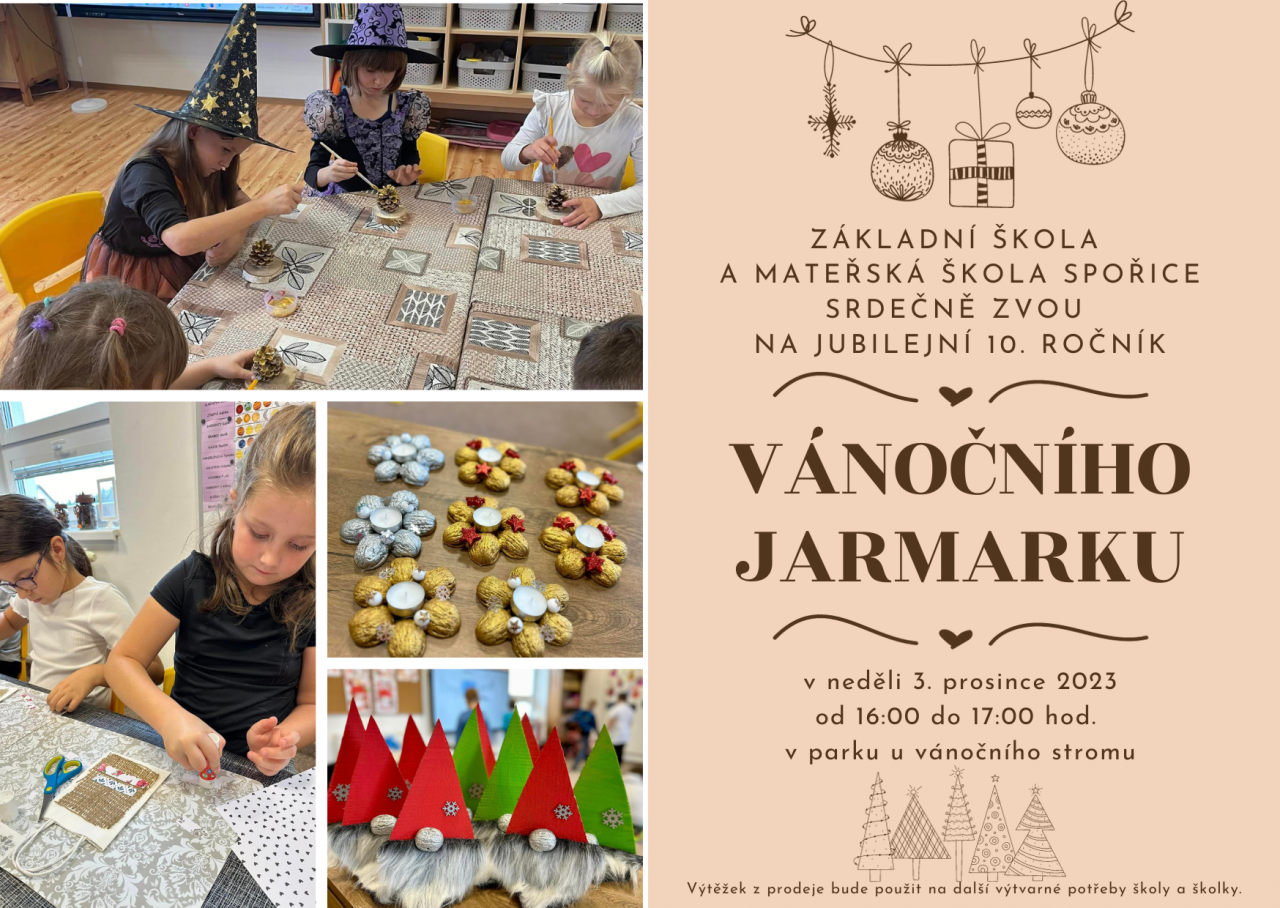 Základní škola a Mateřská škola Spořice srdečně zvou na jubilejní 10. ročník Vánočního jarmarku, kde děti nabídnou k prodeji ručně vyrobené vánoční dekorace.