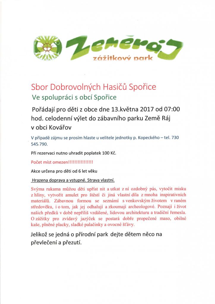 Sbor dobrovolných Hasičů Spřice ve spolupráci s obcí Spořice pořádají zájezd do zábavného parku ZEMĚ RÁJ v obci Kovářov.