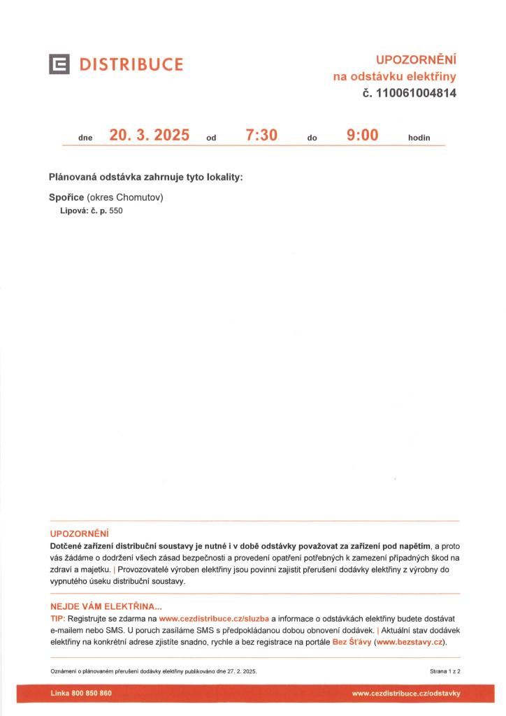 ČEZ DISTRIBUCE a.s. - OZNÁMENÍ O PLÁNOVANÉ ODSTÁVCE ELEKTŘINY