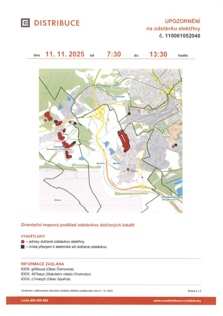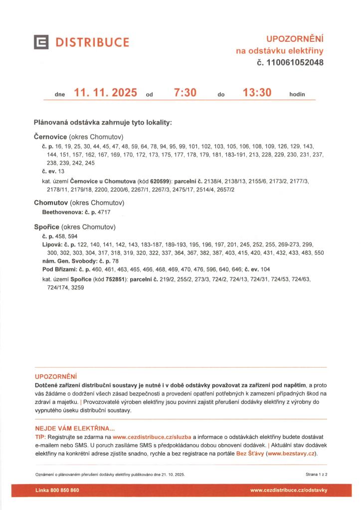 ČEZ DISTRIBUCE a.s. - OZNÁMENÍ O PLÁNOVANÉ ODSTÁVCE ELEKTŘINY