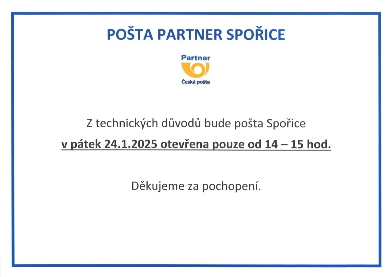 Z technických důvodů bude pošta Spořice v pátek 24.1.2025 otevřena pouze od 14 - 15 hod.