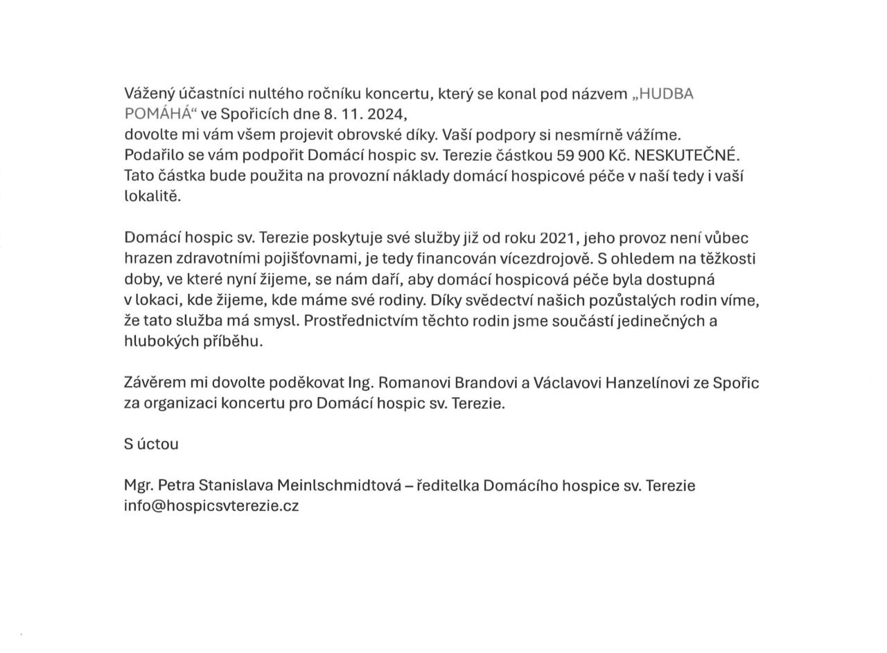 Rádi bychom vyjádřili poděkování kapelám a všem účastníkům, kteří přišli na nultý ročník benefičního koncertu "HUDBA POMÁHÁ" a podpořili tak Domácí hospic sv. Terezie. Díky Vaší štědrosti se vybrala krásná částka Kč 59 900,-. Vaše podpora má skutečný význam a pomáhá tam, kde je to nejvíce potřeba.