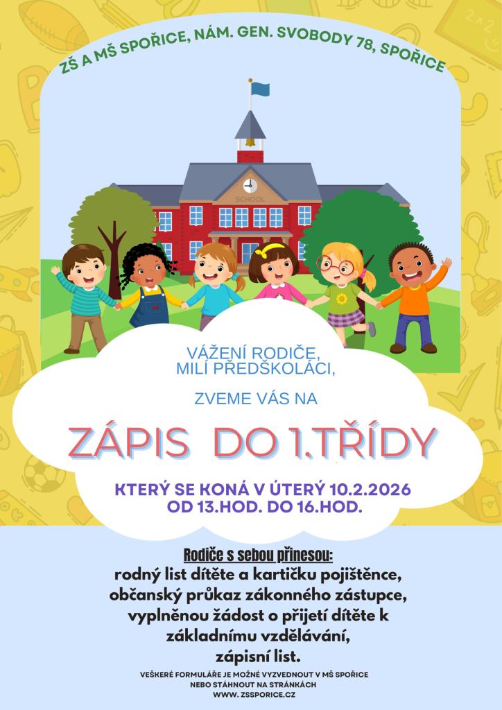 Základní škola Spořice zve děti a jejich rodiče k zápisu do 1. třídy. Přijďte si vyzkoušet, jaké to je být školákem, a udělat první krok do světa učení a nových kamarádů.