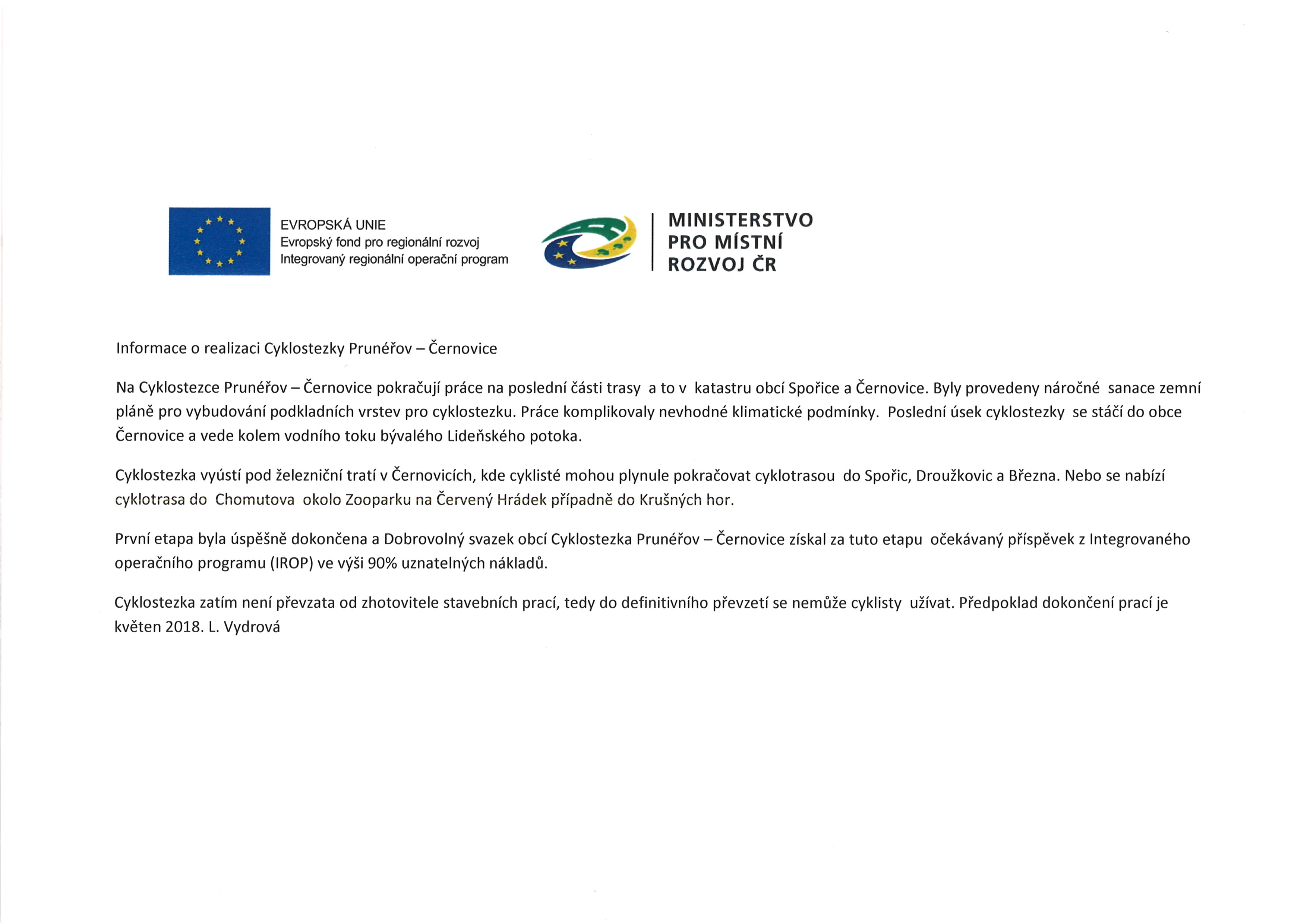 Na Cyklostezce Prunéřov – Černovice pokračují práce na poslední části trasy a to v katastru obcí Spořice a Černovice. Byly provedeny náročné sanace zemní pláně pro vybudování podkladních vrstev pro cyklostezku. Práce komplikovaly nevhodné klimatické podmínky. Poslední úsek cyklostezky se stáčí do obce Černovice a vede kolem vodního toku bývalého Lideňského potoka.