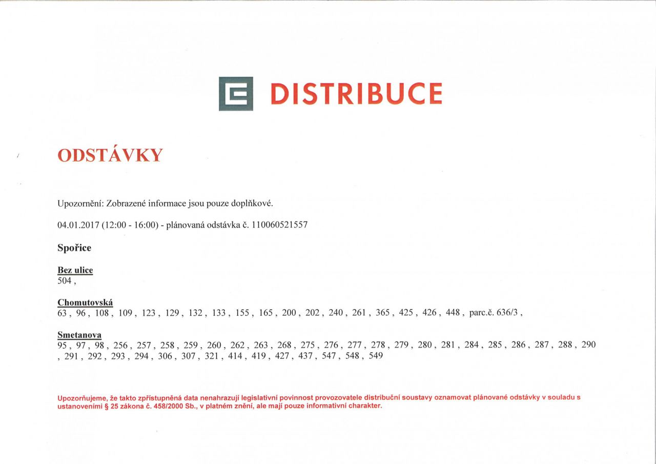 ČEZ Distribuce, a.s. oznamuje, že dne 4.1.2017 od 12:00 do 16:00 hodin bude přerušena dodávka elektřiny v ulicích Chomutovská a Smetanova ve Spořicích.