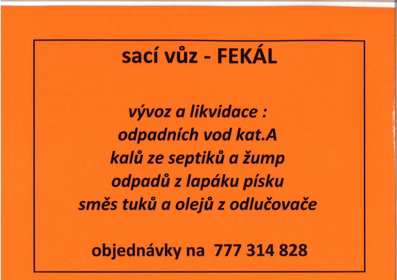 Sací vůz - FEKÁL vývoz a likvidace: -odpadních vod kat. A -kalů ze septiků a žump -odpadů z lapáku písku -směs tuků a olejů z odlučovače Objednávky na tel.: 777 314 828
