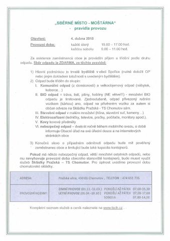 Zahájení provozu a pravidla provozu SBĚRNÉHO MÍSTA - MOŠTÁRNA